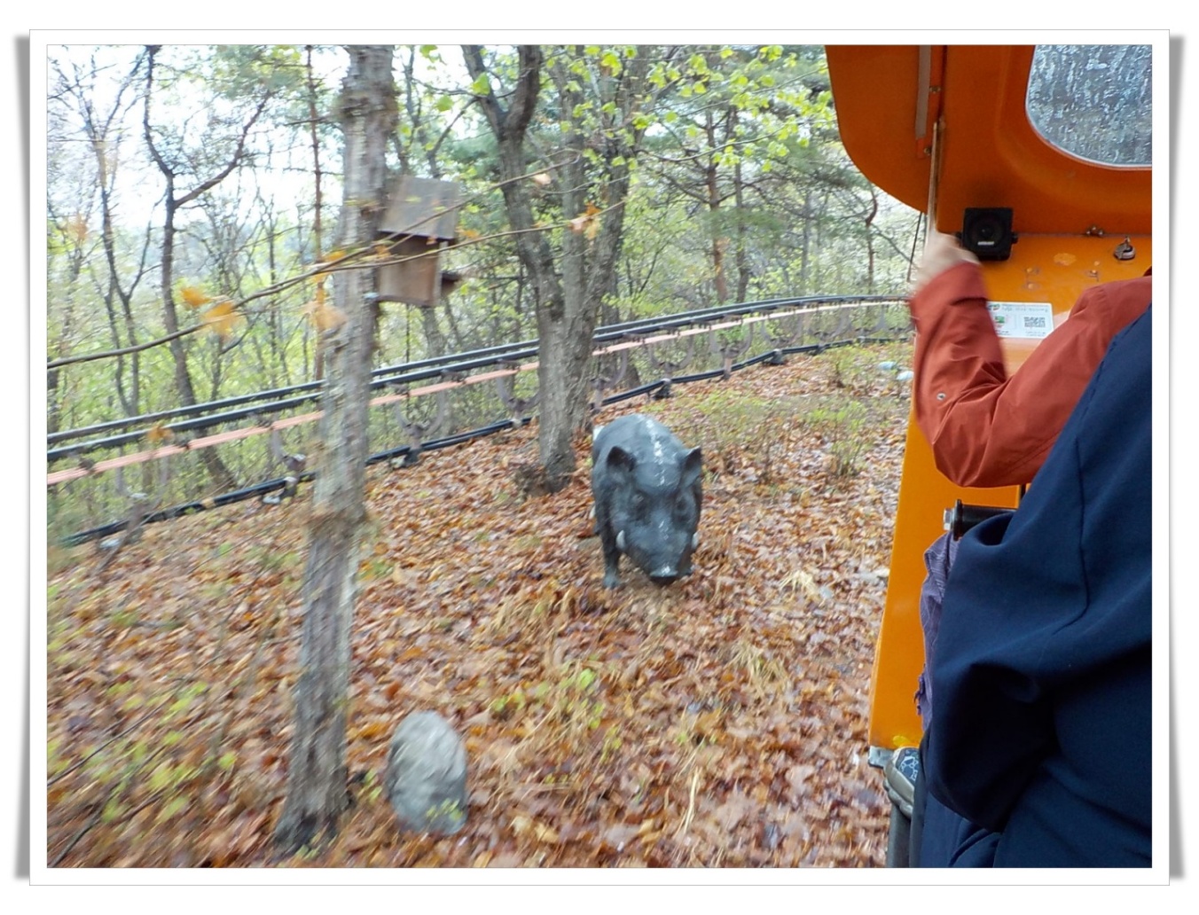 모노레일 탑승 시간을 12시로 예약을 했지만, 제가 20분 정도 일찍 도착했고, 사람이 많지 않아서 11시 50분쯤 모노레일을 탑승하게 되었습니다. 숲속으로 작은 철길이 쭉 깔려있고, 출발지에는 멧돼지, 사슴, 나비 등의 조각상들이 귀엽게 놓여 있습니다. 고도차가 400m 정도 되는 산을 오르는 철길이라 오르고 내리는 구간에서는 아주 살짝 짜릿했습니다. 의자에 있는 안전벨트도 맸고, 운행 속도도 빠른 걸음 정도의 속도로 느린 편이라 무섭지는 않습니다.