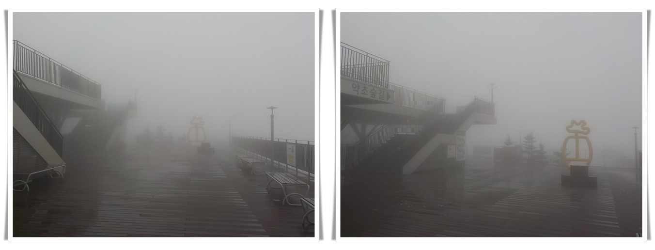 몸을 얼추 녹이고, 2층에 있는 전망대로 가보았습니다. 모노레일을 타고 오르면서 느끼고 있었지만, 역시나 청풍호의 아름다움은 볼수 없었습니다. 자욱한 안개로 바로 앞에 있는 조형물도 어렴풋하게 보이는 상황이었습니다. 포토존도 많고, 약초숲길이라는 산책길도 있는데 그냥 전망대까지 온 걸로 만족해야 했습니다. 건물 탐험 겸 3층으로 올라가 보니, 디저트카페도 있고, 선물샵도 있습니다. 야외 데크에는 테이블도 많이 있었는데, 머물지 못하는 오늘이 좀 안타까웠습니다. 다음을 기약하며 내렸던 승강장으로 돌아가 무사히 내려왔습니다.
