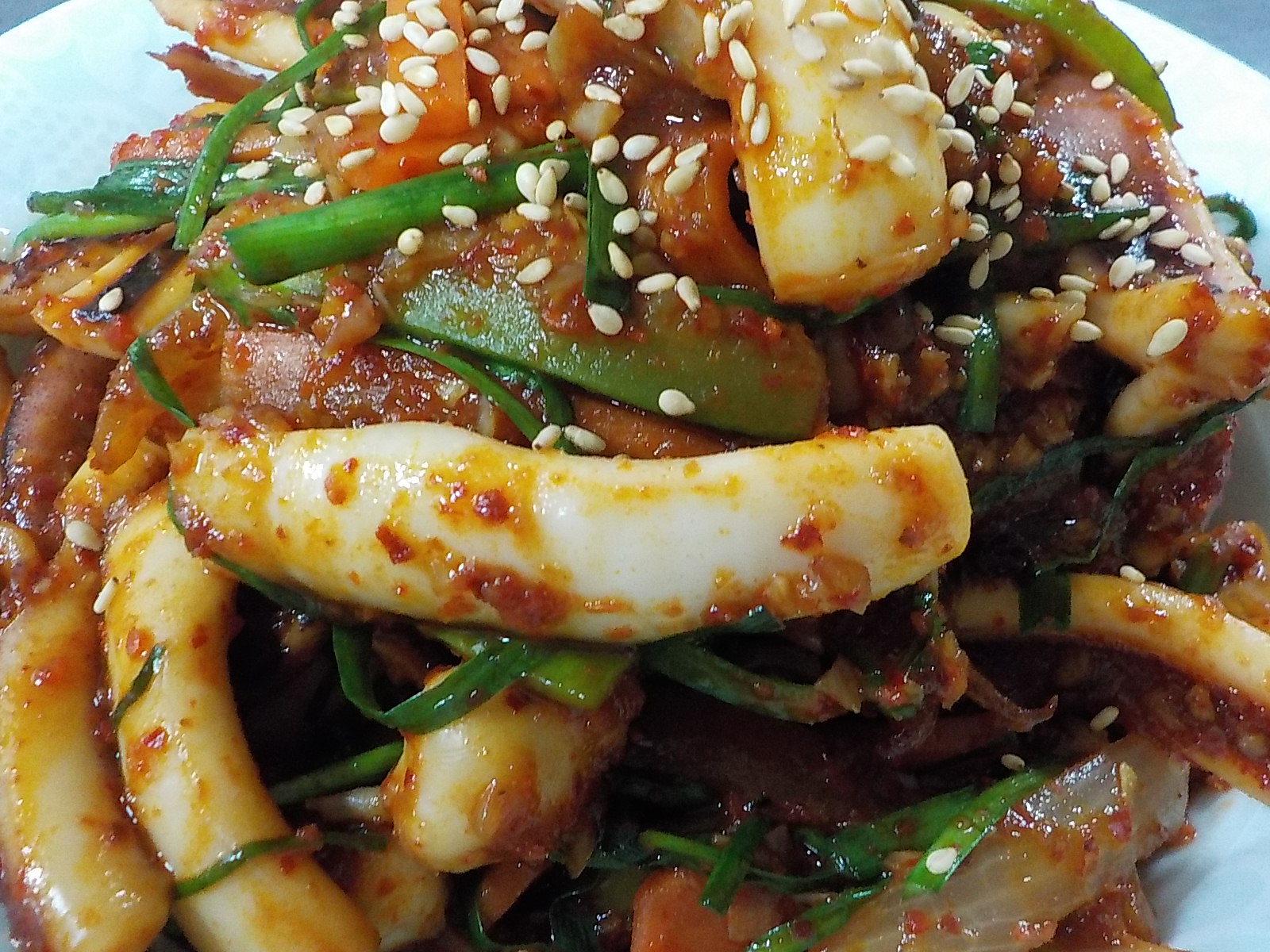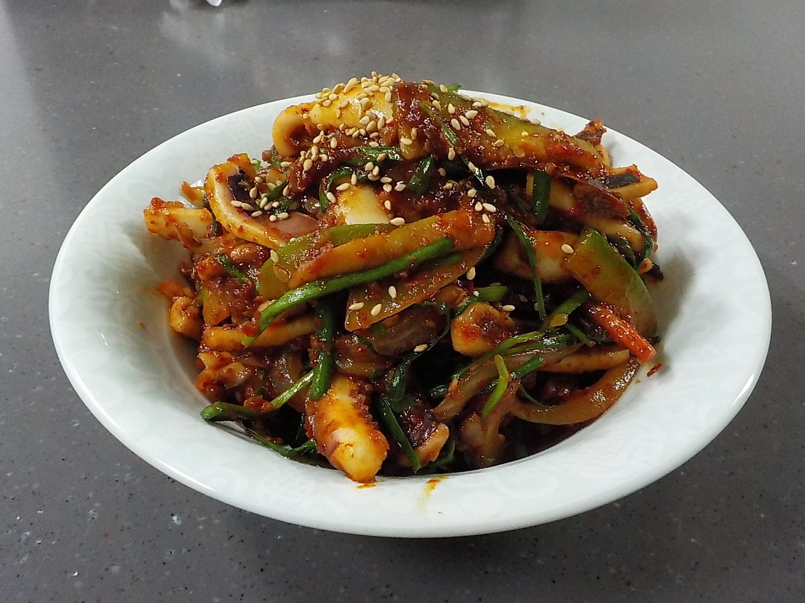 그릇에 오징어볶음을 담고, 요리의 마무리급인 통깨를 살짝 뿌려서 맛있게 드시기만 하면 됩니다. 사실 오징어볶음을 만든 냄비를 통째로 식탁에 올려서 먹다가 밥이랑 김을 넣어서 볶아 드시면 그게 더 맛이 좋긴 합니다. 제가 플레이팅과는 거리가 먼 사람이라 지극히 개인적인 감성으로 맛도 더 좋은 것 같은 기분이 드는 것도 있지만, 볶음 요리의 마무리는 볶음밥이라는 것은 대부분 수긍하지 않을까 싶습니다.