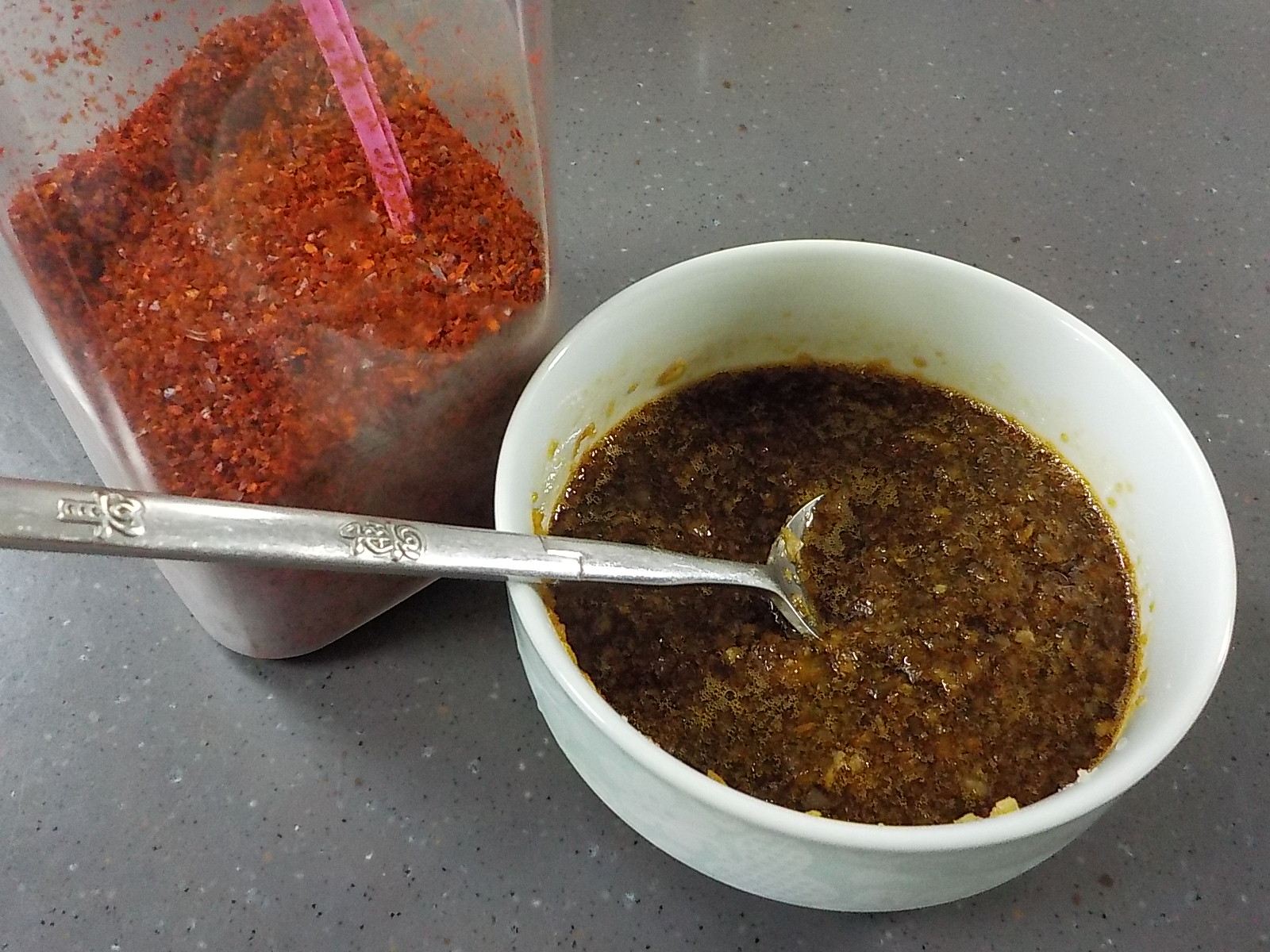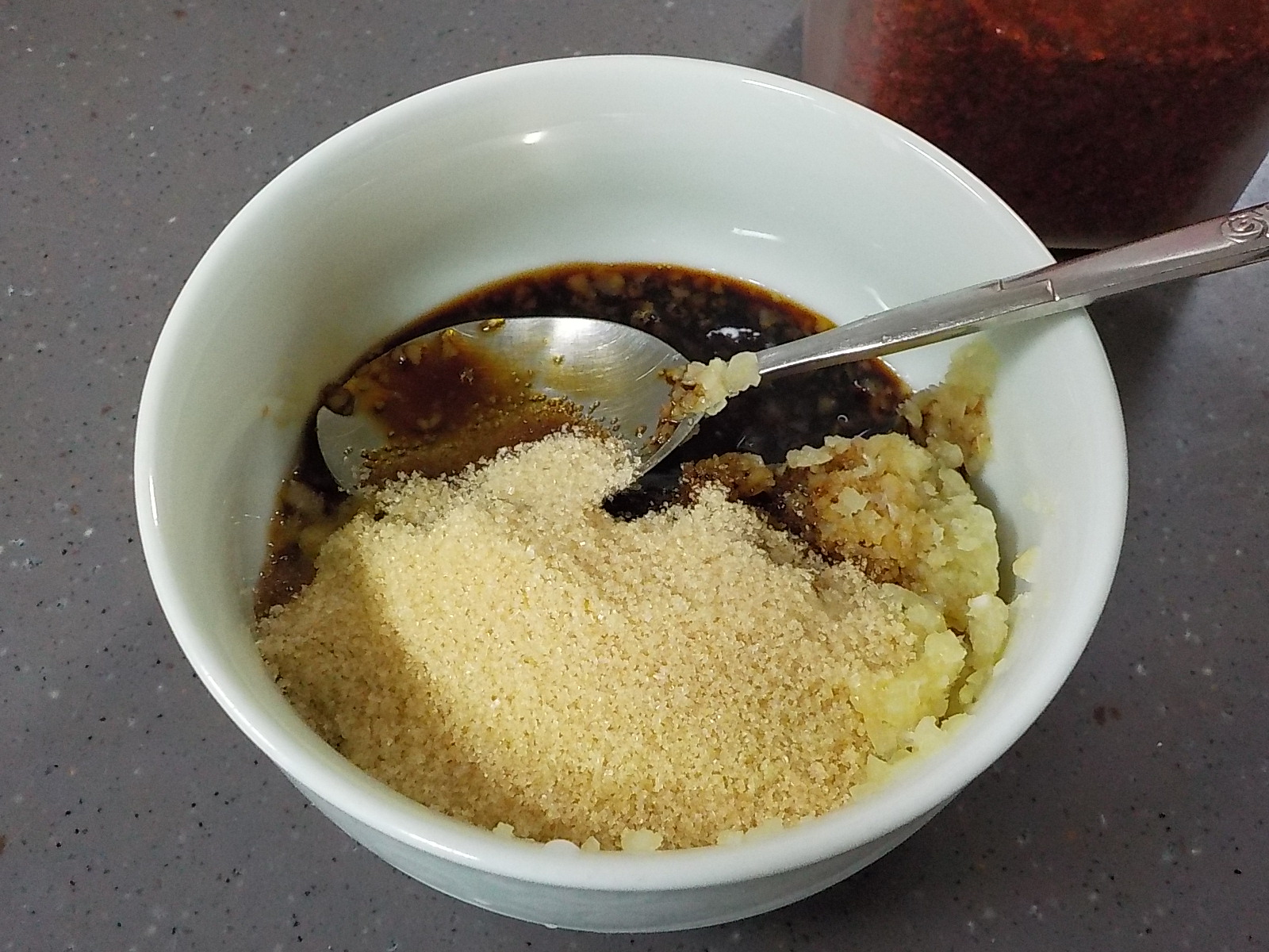 오징어볶음을 만들기 위해 가장 먼저 양념장을 준비해 둡니다. 오징어볶음 양념장의 기본은 양조간장, 고추가루, 설탕, 간마늘만 있으면 됩니다. 여기에 맛술이 있으면 더 좋습니다. 텔레비전에서 셰프들이 고기나 생선 요리를 할 때 생강즙이나 법주 등과 같은 재료를 이용하는 것을 보신 적이 있으실 겁니다. 근데 평소에 웬만큼 요리를 하지 않고서는 생강즙이나 법주를 구비해 놓으신 분들이 많지는 않을 것 같은데 그와 유사한 기능을 하는 식자재가 맛술이라고 보시면 됩니다. 맛술은 생강 + 설탕 + 술의 조합이라고 할 수 있는데, 고기, 생선, 닭, 해물 등과 같은 재료로 요리를 할 때 비린내나 누린내를 없애는데 효과적입니다. 제품도 다양하게 나와 있기 때문에 마음에 드시는 맛술로 선택해서 한 병쯤 구매해서 요긴하게 사용하시기를 추천드립니다. 오늘 만들 오징어볶음으로 오징어를 두 마리 준비해서 그에 맞추어 양념장을 만들어 보겠습니다. 간 마늘 큼지막한 2큰술 (마늘은 많이 넣을수록 맛있다고 생각합니다^^), 양조간장 3큰술, 설탕 2큰술, 맛술 2큰술를 잘 섞어 둡니다. 이때 중요한 키포인트는 고춧가루는 섞지 않는 것입니다. 이유는 요리 과정에서 설명드릴게요. 일단 여기까지 양념장을 준비합니다.