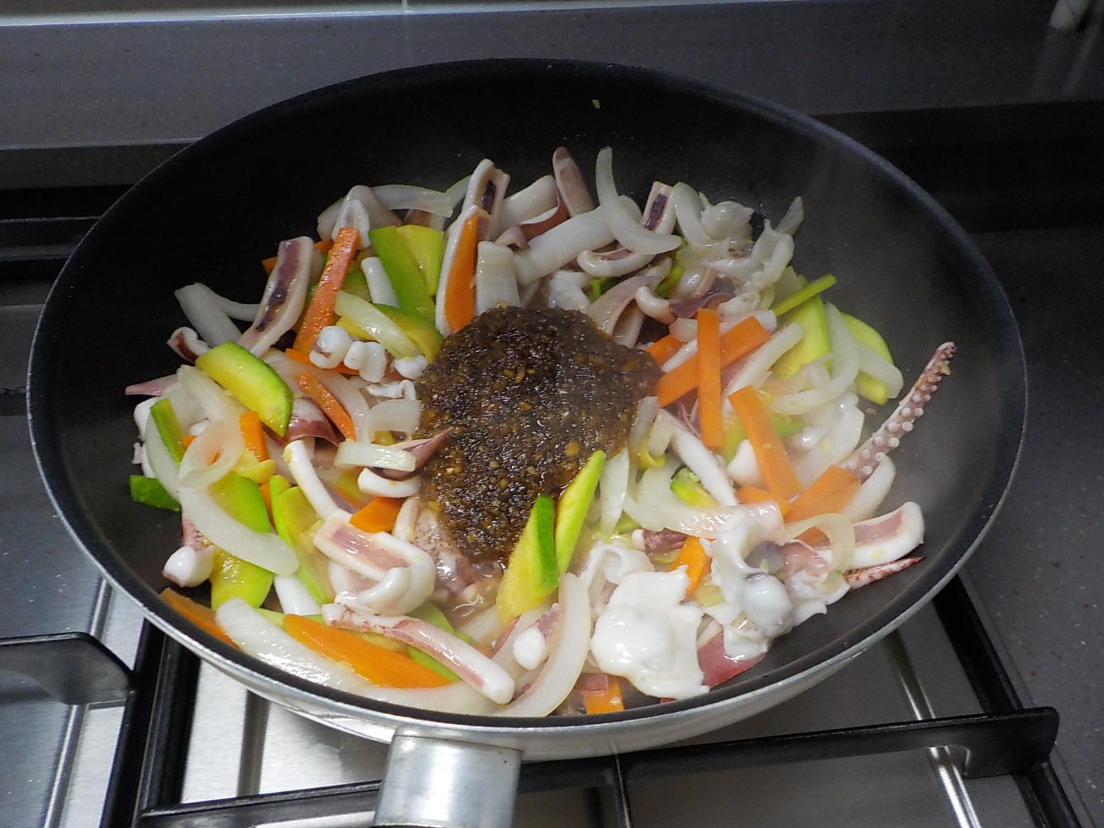 재료가 준비되면 볶기만 하면 되는데요, 양에 따라 차이는 있으나 볶는 시간은 6~7분내로 끝이 납니다. 식용유를 웍에 둘러서 기름이 달구어 지면 야채 → 오징어 → 양념장 → 고추가루 → 부추(대파) 순서로 넣어 주면 됩니다. 불 조절은 중불과 센 불의 중간 정도에 맞추어 주세요. 중불 이하는 별로라는 점 기억해 두세요. 야채는 30초 내로 짧게 볶아 주는데, 개인 취향에 따라 많이 익혀 먹고 싶은 야채를 먼저 넣고 한번 휘리릭 볶은 후 다음 야채를 넣으셔도 되고, 한꺼번에 몽땅 넣어도 상관없습니다. 야채가 데워졌다는 기분이 들 정도로만 볶고 오징어를 넣습니다. 투명한 오징어가 거의 하얗게 변하면 양념장을 넣어서 계속 볶아 줍니다. 볶음 요리인데 수분이 많이 나와서 당황되실 텐데요, 걱정하지 않으셔도 됩니다. 고춧가루를 3큰술 넣어서 볶다보면 오징어에서 나온 수분을 고춧가루가 확 흡수하면서 맛있는 향과 빛깔이 나옵니다. 양념장 만들때 고추가루를 섞지않고 마지막에 넣는 이유가 고추가루가 매콤한 맛과 향을 내는 역할뿐만 아니라 오징어나 야채에서 나온 수분을 흡수하는 중요한 역할을 하기 때문입니다. 오징어볶음을 그릇에 내기 직전에 부추를 넣어서 잘 섞이게만 볶아 주시면 됩니다.